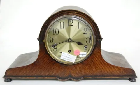 Fancy Oak Dual Chiming Mantle Clock Fancy Oak Dual Chiming Mantle Clock: 5 1/2" dial; 9 rod strike.