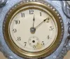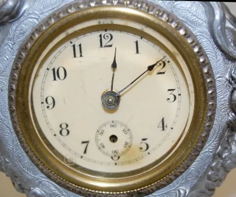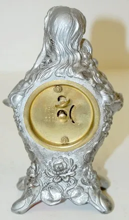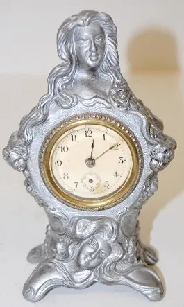 Metal Art Nouveau Novelty Clock: with 2 ladies heads and cherubs; silver painted on metal; time only; acid etched S on glass. (No second hand.) 6 1/2"