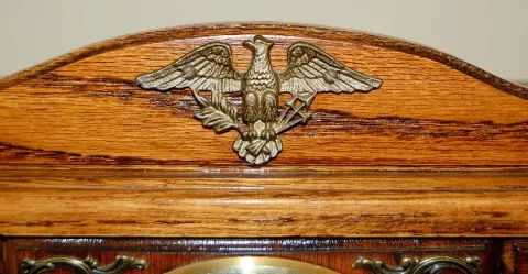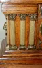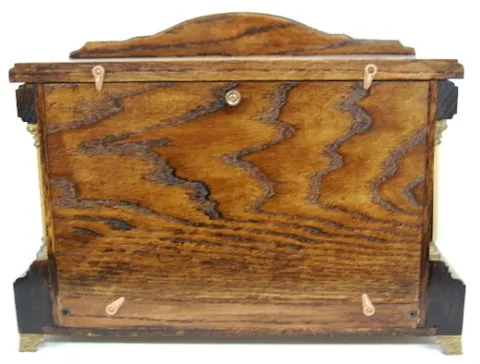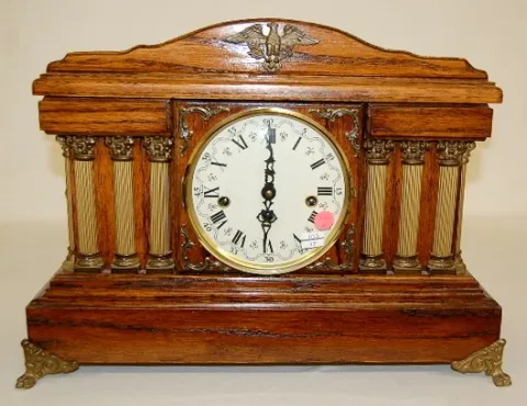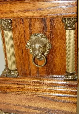 German Oak 6-Column Chiming Mantle Clock: lion heads; Westminster chime; 5 rod strike; very heavy; not antique. (Time gear spring wont catch, can't wi...