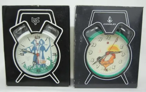 Group of 8 Chang-Feng Animated Alarm Clocks 8 Chang-Feng Animated Alarm Clocks: all in original boxes; dog with ball; fox after rooster; cat fishing; Oriental boy with dragon kite; goose with cat; rooster at sunrise; jack in the box; Oriental motif. Not tested.