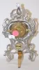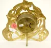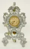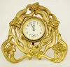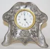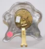 Group of 3 Metal Novelty Dresser Clocks 3 Metal Novelty Dresser Clocks: 1.) Gold colored metal iris frame; Made in U.S.A.; paper dial. (Not running.) 2.) Silver colored metal frame with rooster top; unmarked paper dial; has pendulum; whole back turns as winding device. (Not running.) 3.) Silver colored frame of trees, moon, stars and people; Lux Clock Co. paper dial. (Not running.) Tallest 8"