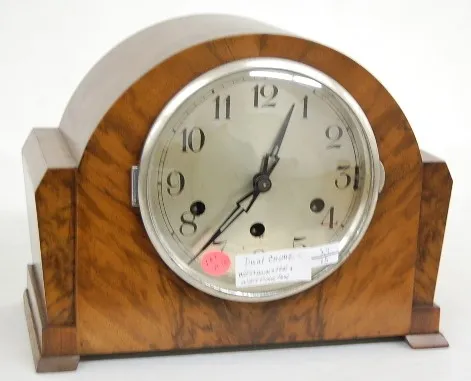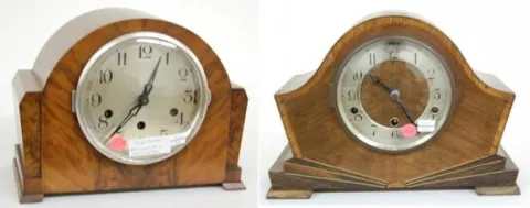 2 Westminster Chimes Mantle Clocks 2 Westminster Chimes Mantle Clocks 1.) Art deco, 5 rod. (Small veneer chips; worn dial; no pendulum.) 2.) Walnut case; dual chime, 8 rod. 9" x 11"