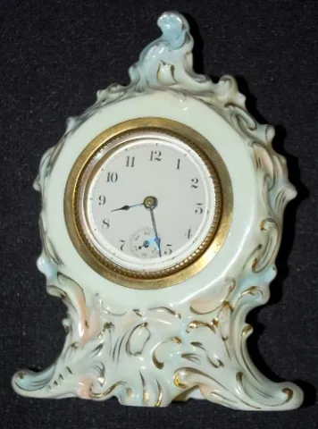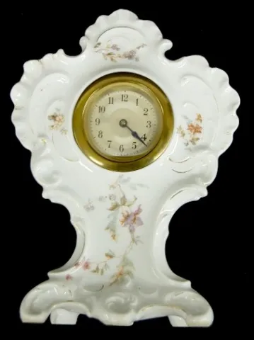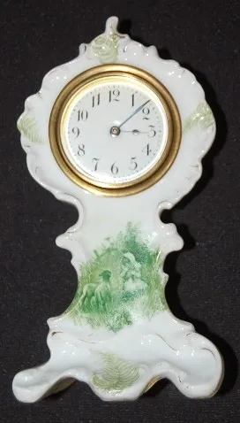 3 Porcelain Decorated Dresser Clocks: 1.) New Haven cased by Rosenthal, Germany; child and sheep on front; 30 hour movement; green and white; porcelai...