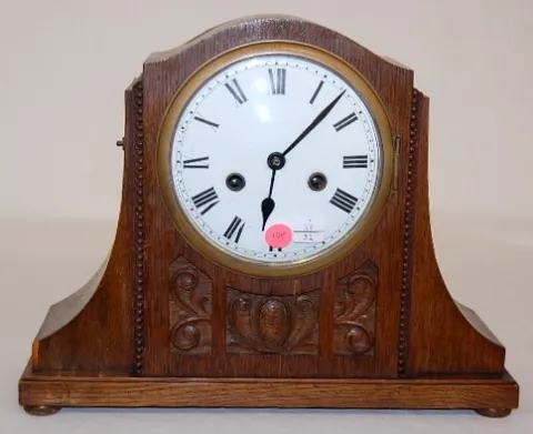 Foreign Oak Carved Mantle Clock Foreign Oak Carved Mantle Clock: 5 3/4" curved porcelain dial; time and strike. (Veneer chips.)