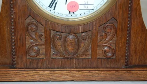 Foreign Oak Carved Mantle Clock: 5 3/4" curved porcelain dial; time and strike. (Veneer chips.)