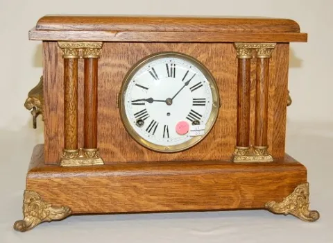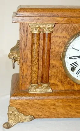 Oak 4-Column Mantle Clock Oak 4-Column Mantle Clock: time and strike; metal dial; lion heads.