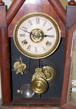 Steeple Clock w/Alarm: paper dial with alarm center ring; time and strike with alarm; not marked; paper label; with pendulum and key; not tested. (As ...