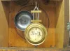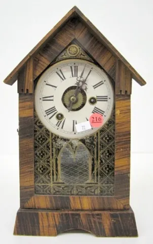Small German Shelf Clock w/Alarm Small German Shelf Clock w/Alarm: bell strike; pendulum; off set winding arbors at 3 and 7:30. 12"