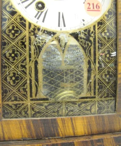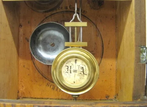 Small German Shelf Clock w/Alarm: bell strike; pendulum; off set winding arbors at 3 and 7:30. 12"