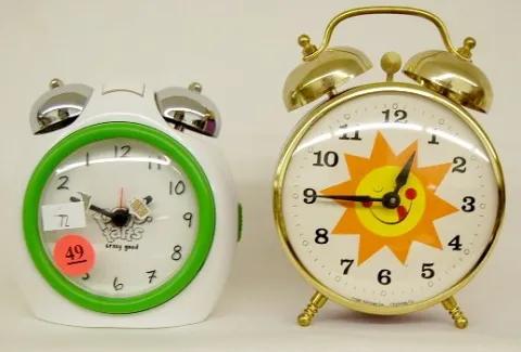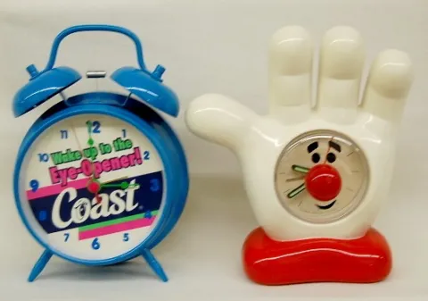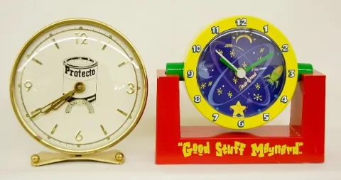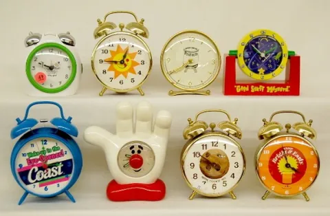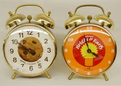 8 Advertising Alarm Clocks: 1.) 1981 Kellogg Co. Sun; bell top. 2.) Lux Enjoy Bright and Early Orange Juice; bell top. 3.) Nestle Cookie Mix; Lafayett...