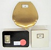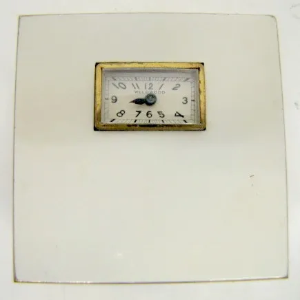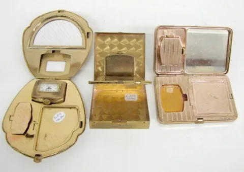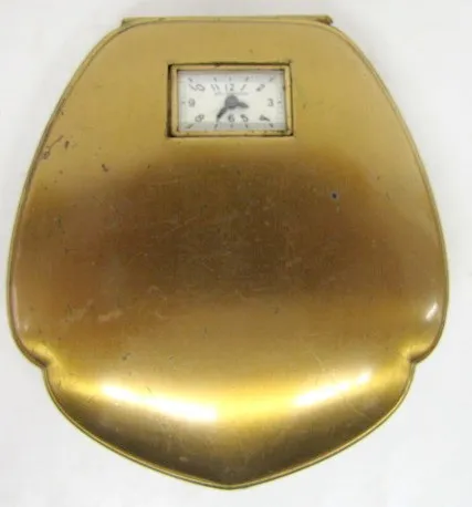 Group of 3 Vintage Metal Clock/Compacts 3 Vintage Metal Clock/Compacts: black Ingraham compact; white Weldwood compact; Elgin Watch Case co. brushed shell shaped compact. Not tested for running condition; all sell in as is, as found condition.