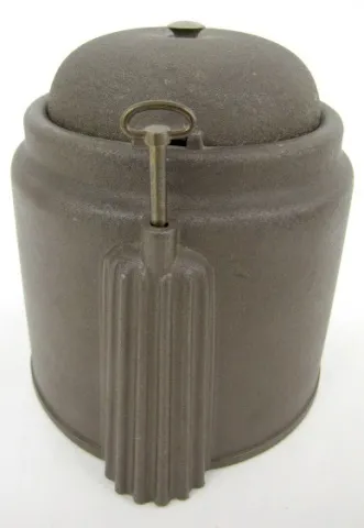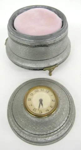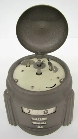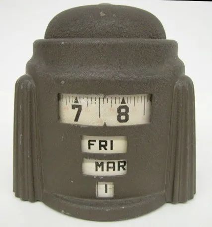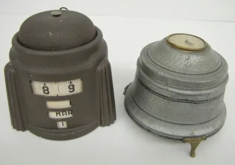 Metal Desk and Powder Box Clock Metal Desk and Powder Box Clock: 1.) Music box/powder box clock. (Not working.) 2.) Metal calendar tape measure alarm clock; art deco; painted metal body.