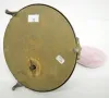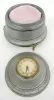Metal Desk and Powder Box Clock: 1.) Music box/powder box clock. (Not working.) 2.) Metal calendar tape measure alarm clock; art deco; painted metal body.