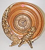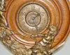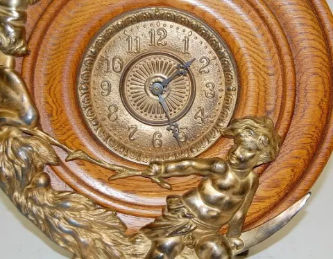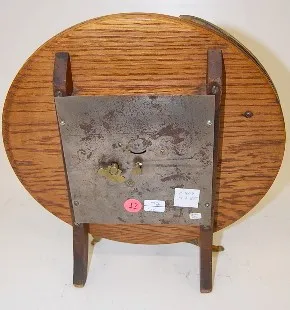 Oak Man in the Moon Dresser Clock: round oak with Man in the Moon face on one side with a child poking him with a stick on the bottom; metal dial; thumb wind. (Not running.) 13"