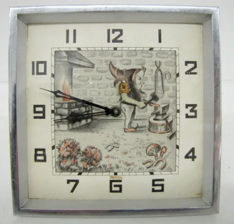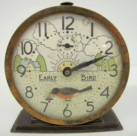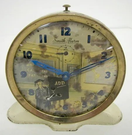3 Antique Animated Alarm Clocks 3 Antique Animated Alarm Clocks: 1.) Elf blacksmith. 2.) Early bird with robin and worm. 3.) Smith math teacher.