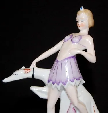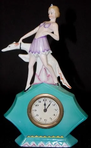 Germany Porcelain Art Deco Figural Clock: girl with greyhound; 30 hour movement; case marked 4873 Germany No. 26 in red; paper dial; thumb wind. (Not ...
