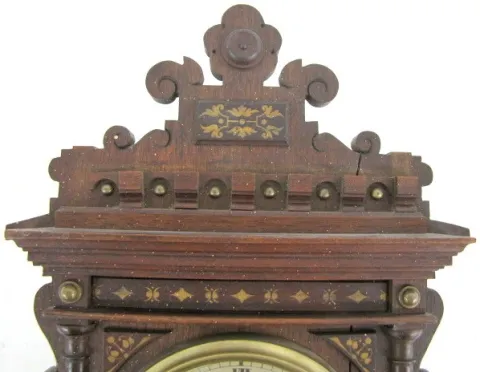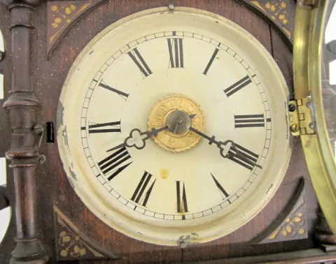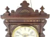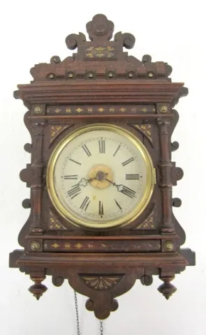 Black Forest Miniature Hanging Clock w/Alarm: walnut case; 4" dial. (Paint spattered on case.) 15 1/2" x 9"