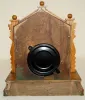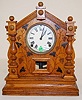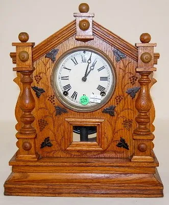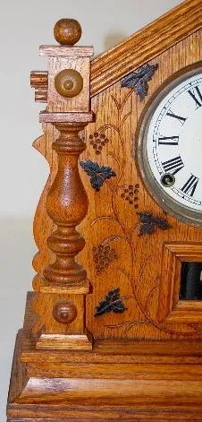 English Oak Grape Carved Cabinet Clock English Oak Grape Carved Cabinet Clock: fancy case; time and strike; 4 1/2" dial; pendulum.