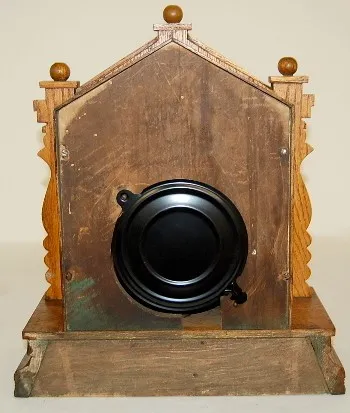 English Oak Grape Carved Cabinet Clock: fancy case; time and strike; 4 1/2" dial; pendulum.