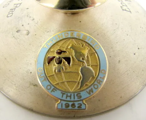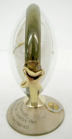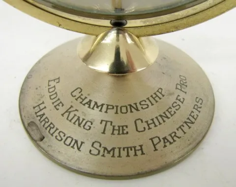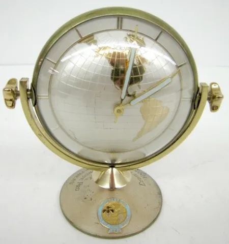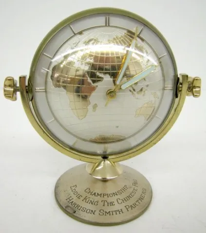 German Double Sided Globe Presentation Clock: partners desk clock; different continents on each side; engraving reads "Championship Eddie King the Chi...