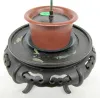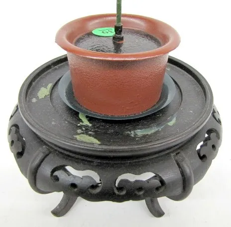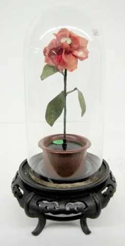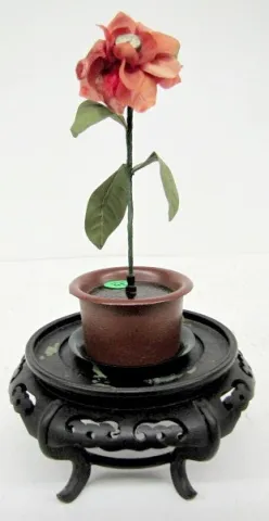 Red Rose Potted Plant Novelty Clock: maker unknown, key wind; metal pot with a red rose coming out of it with a tiny clock in the center of the rose. Comes on an Oriental stand with a glass dome; dome and stand not original to clock. 8" and running at this time