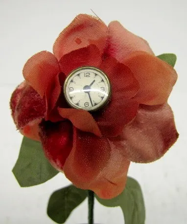 Red Rose Potted Plant Novelty Clock Red Rose Potted Plant Novelty Clock: maker unknown, key wind; metal pot with a red rose coming out of it with a tiny clock in the center of the rose. Comes on an Oriental stand with a glass dome; dome and stand not original to clock. 8" and running at this time