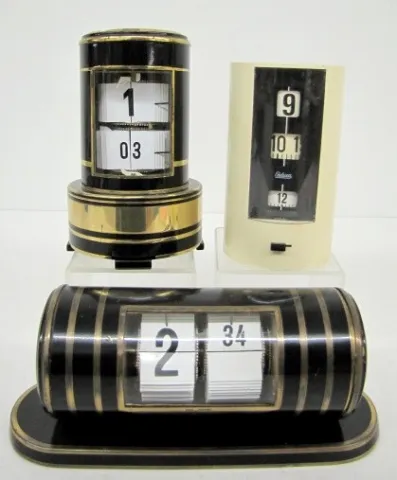 3 Digital Deco Desk Clocks 3 Digital Deco Desk Clocks: 1.) Wind up black and brass West Germany 7J; 8 day. 2.) Black and brass horizontal shape; German. 3.) German; plastic body; Endura. (Some scratches and wear; not tested.) Longest 7 3/4"