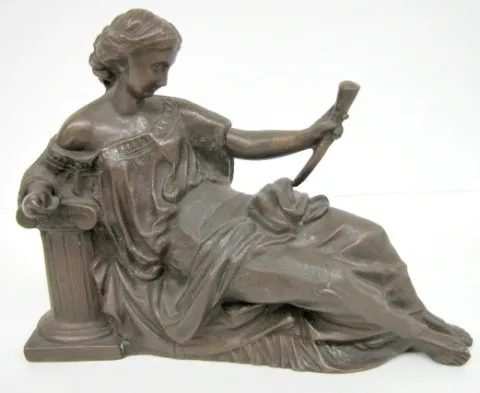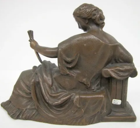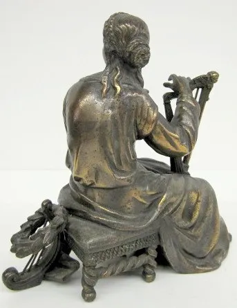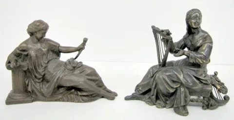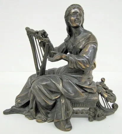 2 Clock Statues, Bronzed and Spelter 2 Clock Statues, Bronzed and Spelter: 1.) Bronzed clock statue, girl with flute; not marked, 7". 2.) Spelter clock statue, girl with harp; JA on the bottom, 8".