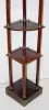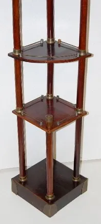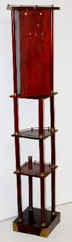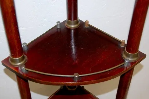 R.A. Clock on Mahogany Corner Shelf R.A. Clock on Mahogany Corner Shelf: unusual brass trim; mahogany 3-tier corner shelf R.A.; porcelain dial. 69" x 15" *** Please note, this item is F.O.B. Marshalltown, IA, you must make shipping arrangements.