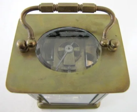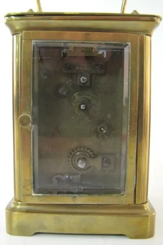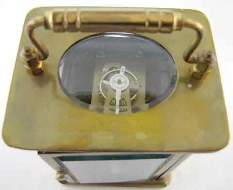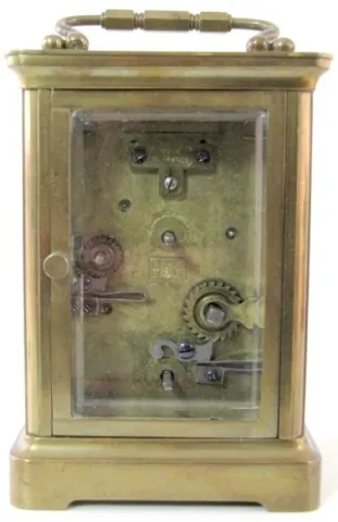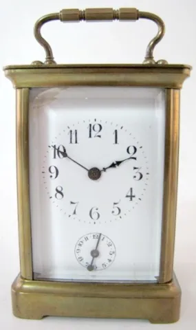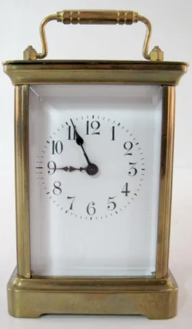 2- 8 Day French Carriage Clocks 2- 8 Day French Carriage Clocks: 1.) 8 day time only; porcelain dial; Arabic numerals; beveled glass. 2.) 8 Day French Carriage Clock w/Alarm: 8 day time and alarm; porcelain dial; Arabic numerals; beveled glass. 5 1/2"
