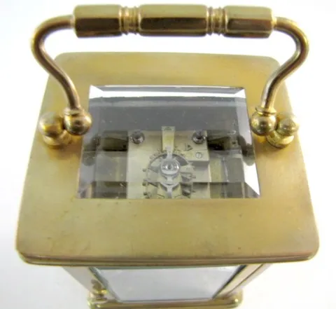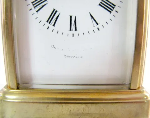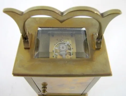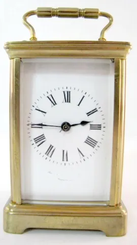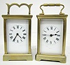 2- 8 Day French Carriage Clocks 2- 8 Day French Carriage Clocks: 1.) 8 day time only; porcelain dial; Roman numerals; beveled glass, has key. 2.) 8 Day French Carriage Clock: 8 day time only; porcelain dial; Arabic numerals; beveled glass, has key. 5 1/2"