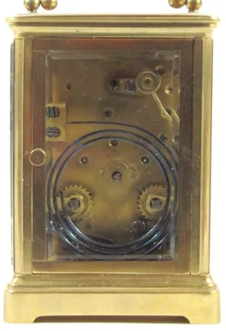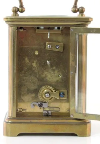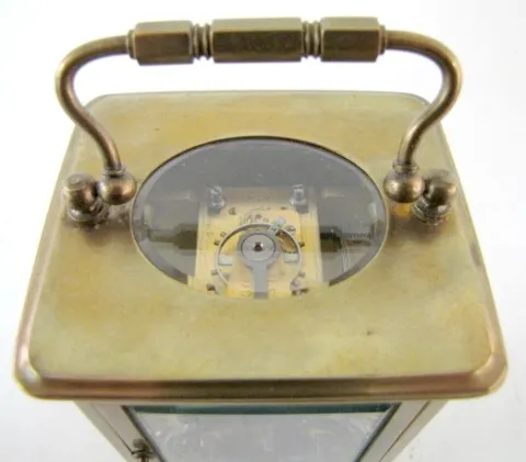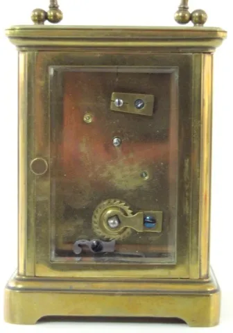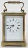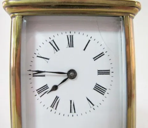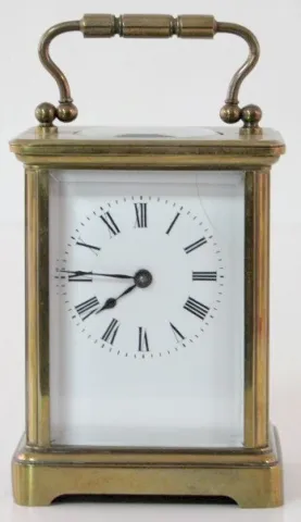 2- 8 Day French Carriage Clocks 2- 8 Day French Carriage Clocks: 1.) 8 day time only; porcelain dial; Roman numerals; beveled glass, has key. (Dial hairlined.) 4 1/2" 2.) 8 Day French Carriage Clock: 8 day time and strike; porcelain dial; Roman numerals; beveled glass, has key. (Dial hairlined.) 5 1/2"