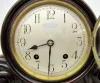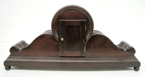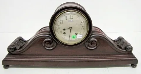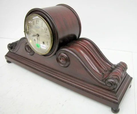 German Chiming Carved Tambour Shelf Clock: mahogany case; metal dial; time and strike. (Dial has paint repair.) 12" x 26"...