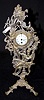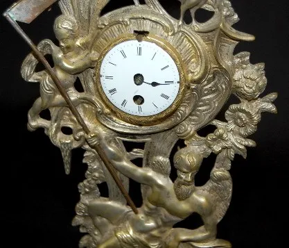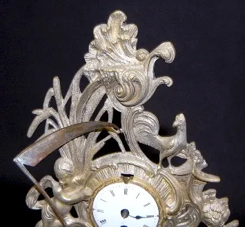 Silver Plated "Old Father Time" Novelty Clock: porcelain dial; figural Old Father Time with scythe; Baby New Year; cattails and rooster. (Bezel missing.) 13 1/4"