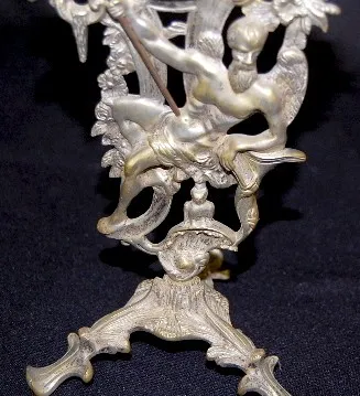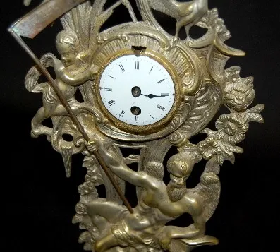 Silver Plated "Old Father Time" Novelty Clock Silver Plated "Old Father Time" Novelty Clock: porcelain dial; figural Old Father Time with scythe; Baby New Year; cattails and rooster. (Bezel missing.) 13 1/4"
