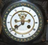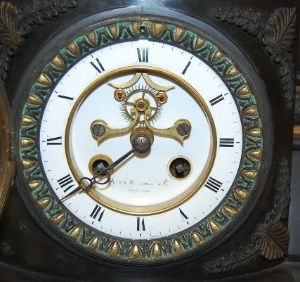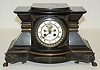 French Black Marble and Bronze Mantle Clock French Black Marble and Bronze Mantle Clock: open escapement; 8 day time and strike; porcelain dial "Alex M. Hays and C. New York"; beveled glass door; sets on 4 toed paw feet; has pendulum; not tested for running condition. (1 piece of front trim missing; screw in the back loose.) 9 1/2" x 14 1/2" x 6 1/4"