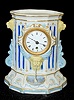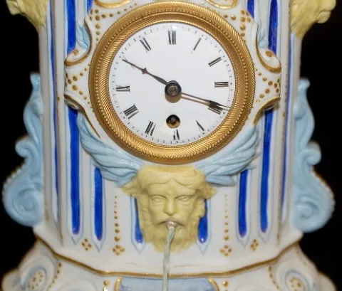 China Water Fountain Clock Base: porcelain dial; movement not marked; no pendulum. Case is a striped pillar with lion heads on the sides and a man's head as the water fountain, should have something on top, but nothing is there. (Water stream looks to have been broken and glued.) 5 3/4" x 5 1/4"