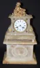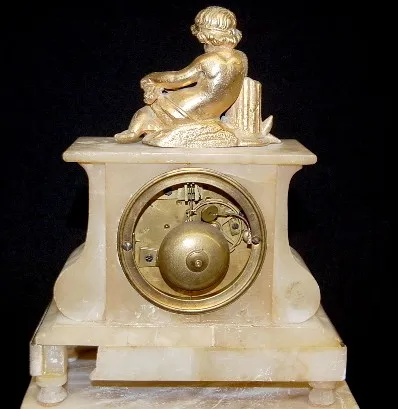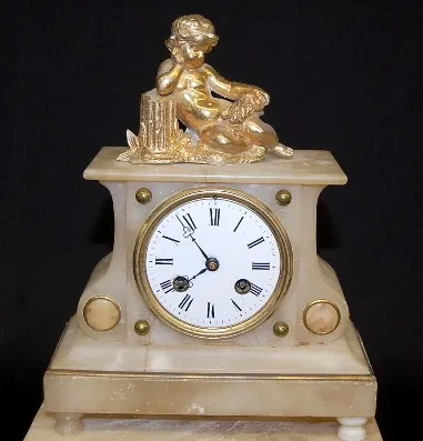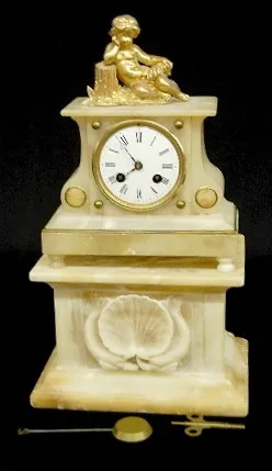 2 pc. French Marble Cherub Clock 2 pc. French Marble Cherub Clock: movement numbered 445; porcelain dial; time and strike; base is carved marble with shell. Not tested for running condition. (No bezel; no back plate; marble damaged on the front and a piece missing off the back; pendulum is too long.) 16"