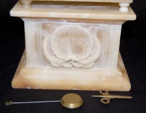 2 pc. French Marble Cherub Clock: movement numbered 445; porcelain dial; time and strike; base is carved marble with shell. Not tested for running condition. (No bezel; no back plate; marble damaged on the front and a piece missing off the back; pendulum is too long.) 16"