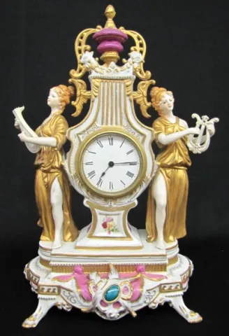 20th Century Dresden Figural Clock 20th Century Dresden Figural Clock: marked on bottom; ladies with mandolin and lyre; rooster heads; paper dial; movement marked but unreadable; not tested. (Cracked from in front of left rear foot to below foot of left figure; movement not complete.) 12"