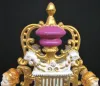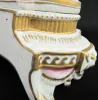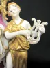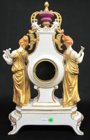 20th Century Dresden Figural Clock: marked on bottom; ladies with mandolin and lyre; rooster heads; paper dial; movement marked but unreadable; not tested. (Cracked from in front of left rear foot to below foot of left figure; movement not complete.) 12"