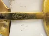 Porcelain Shield w/Falconer Easel Clock: brass marked J.V. Brevette France; easel is crossed Halbergs and armor; face painted with falconer, falcon, castle, lion crest flag and cattails. (Minor chip on lower edge.) 17 1/2" clock 10 1/2" x 7 3/4"