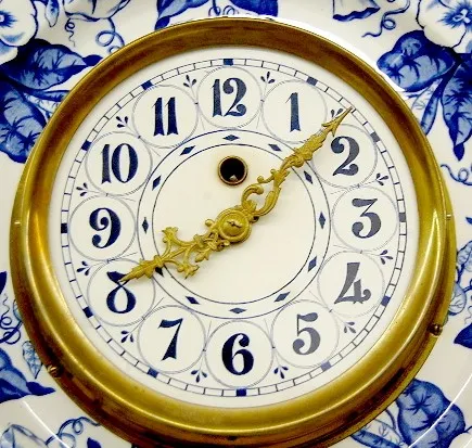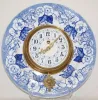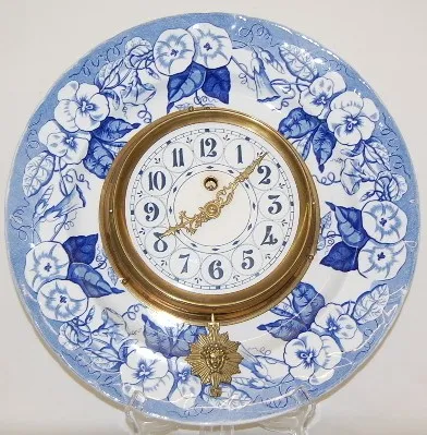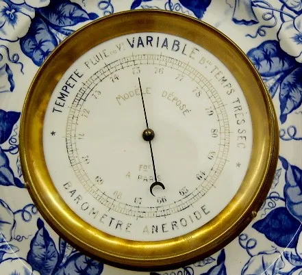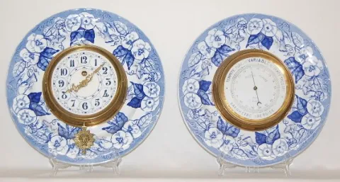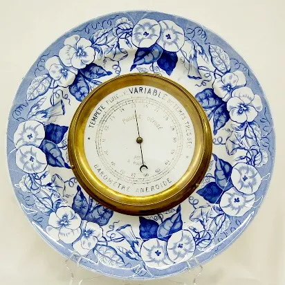 2 French Faience Chargers Clock and Barometer 2 French Faience Chargers w/Pendulette Clock and Barometer: clock time only; blue morning glory design on white; marked Lunevill, France; paper dial with face pendulum. Barometer marked KG (Keller and Guerin); blue morning glory on white; dial "Tempte Pluie ou V Variable Bau Temps Tres Sec Barometre aneroide Modele Depose Fot A Paris". Running condition not known. (Dial somewhat faded.) 14 1/4"