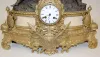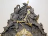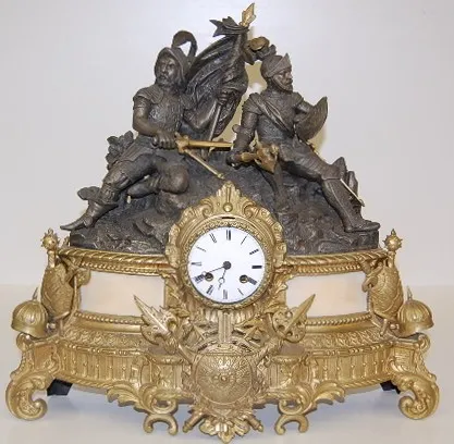 Signed Vincenti Knights Statue Clock Signed Vincenti Knights Statue Clock: porcelain dial; time and strike; 2 knights with flag and weapons; lower case has armor with spike helmets and weapons at the corners; weapons and shields on the front and marble insets; movement signed Vincenti and Cie. (Left side armor is loose; small chip on dial by the 5.) 18" x 19" x 6 1/4" *** Please note, this item is F.O.B. Marshalltown, IA, you must make shipping arrangements.