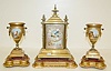 3pc. French Brass Clock Set 3pc. French Brass Clock Set: movement No. 3983 14.7; time and strike; celluloid or plastic inserts with boat scenes; side urns are metal with painted scenes; not tested. (Bases have pieces broken off, some painted over.) 15"
