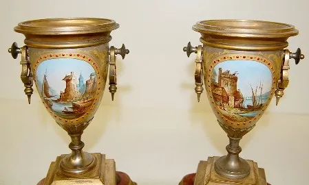 3pc. French Brass Clock Set: movement No. 3983 14.7; time and strike; celluloid or plastic inserts with boat scenes; side urns are metal with painted scenes; not tested. (Bases have pieces broken off, some painted over.) 15"