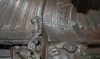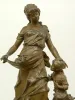 A.D. Mougin French Statue Clock: mother and child with birds and basket; movement marked A.D. Mougin and numbered 1151; porcelain dial; time and strike 8 day movement; base has lion heads sides and 4-toed paw feet. (1 side has been repaired; needs repaired better.) 28"