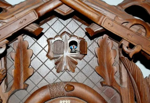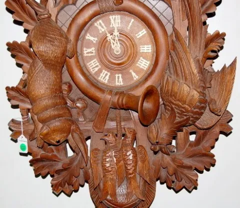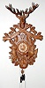 48" Gun and Game Deer Head Cuckoo Clock 48" Gun and Game Deer Head Cuckoo Clock: black forest carved; glass eyes; appears to be walnut; pheasant, rabbit, birds and horn. 48"