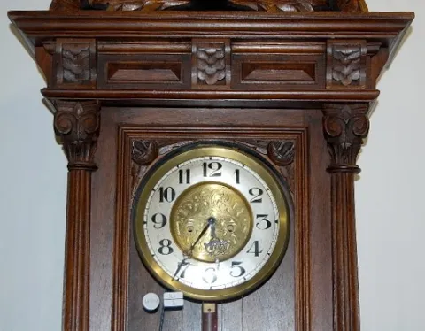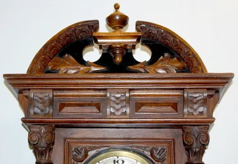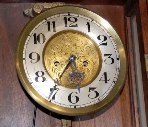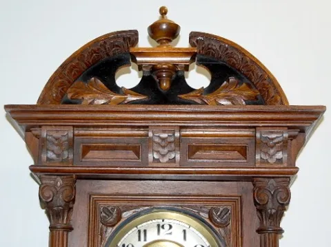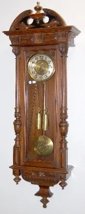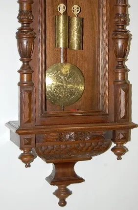 Engraved 2 Wt. German Vienna Regulator Clock: strikes hour and half hour; fancy engraved weights, pendulum and brass dial; serial number 4638; rod gon...
