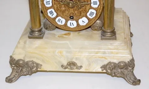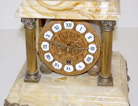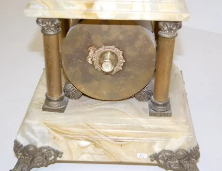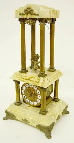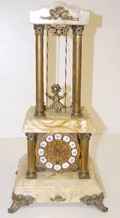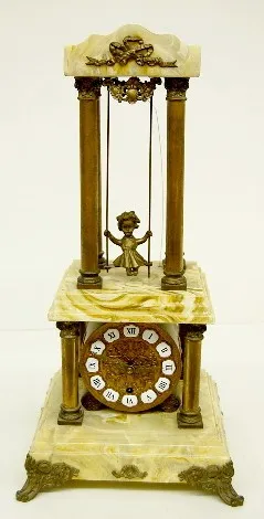 Ornate Marble Swinging Doll Mystery Clock Ornate Marble Swinging Doll Mystery Clock: German 8 day movement in lower section; new back and movement replaced and restored by Steve McKinney; old case, old swinging doll; dial age questionable, may have been replaced; clock looks great, doll swings to and fro. 20 1/4" x 9" x 10"